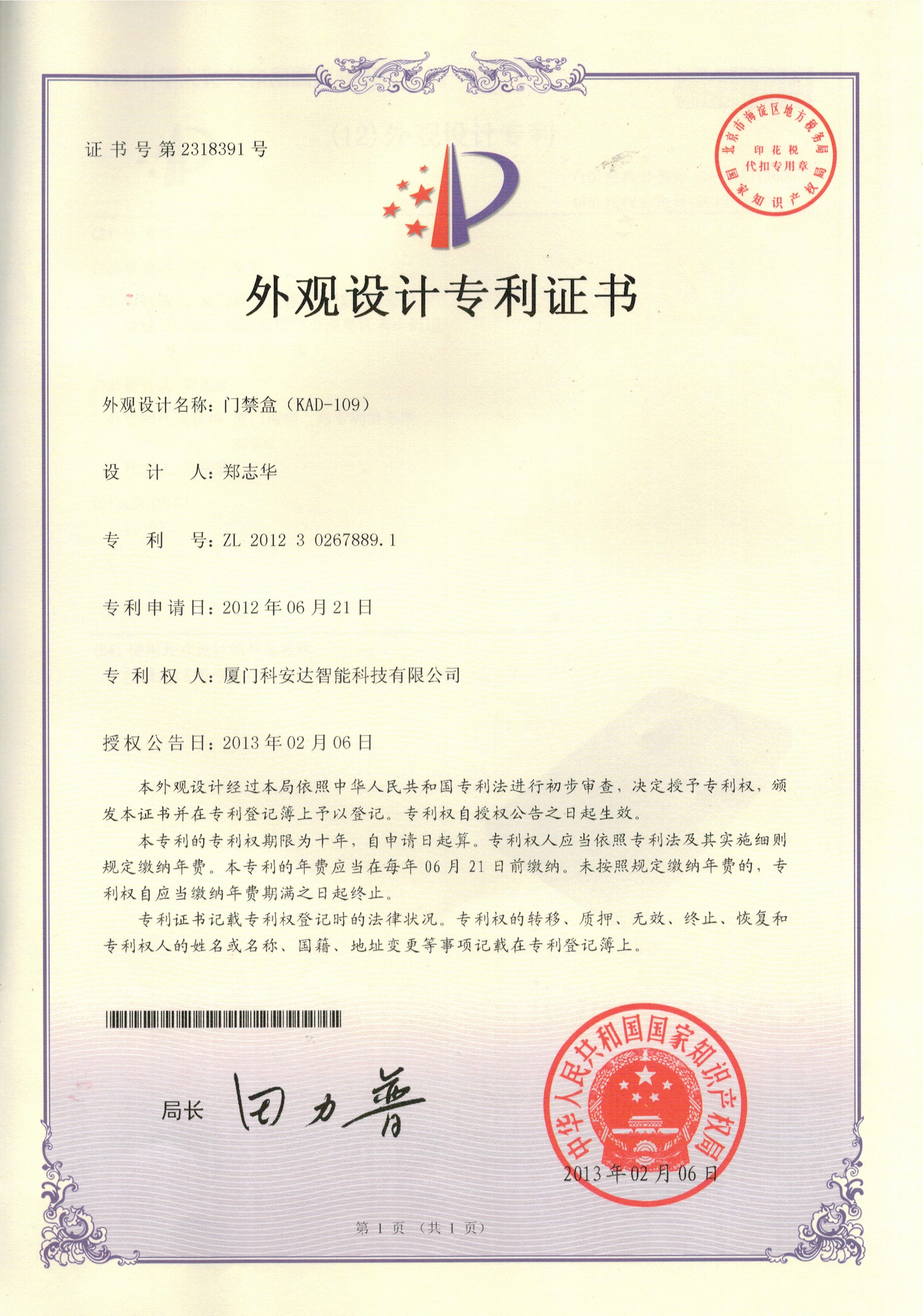 外觀專利證書